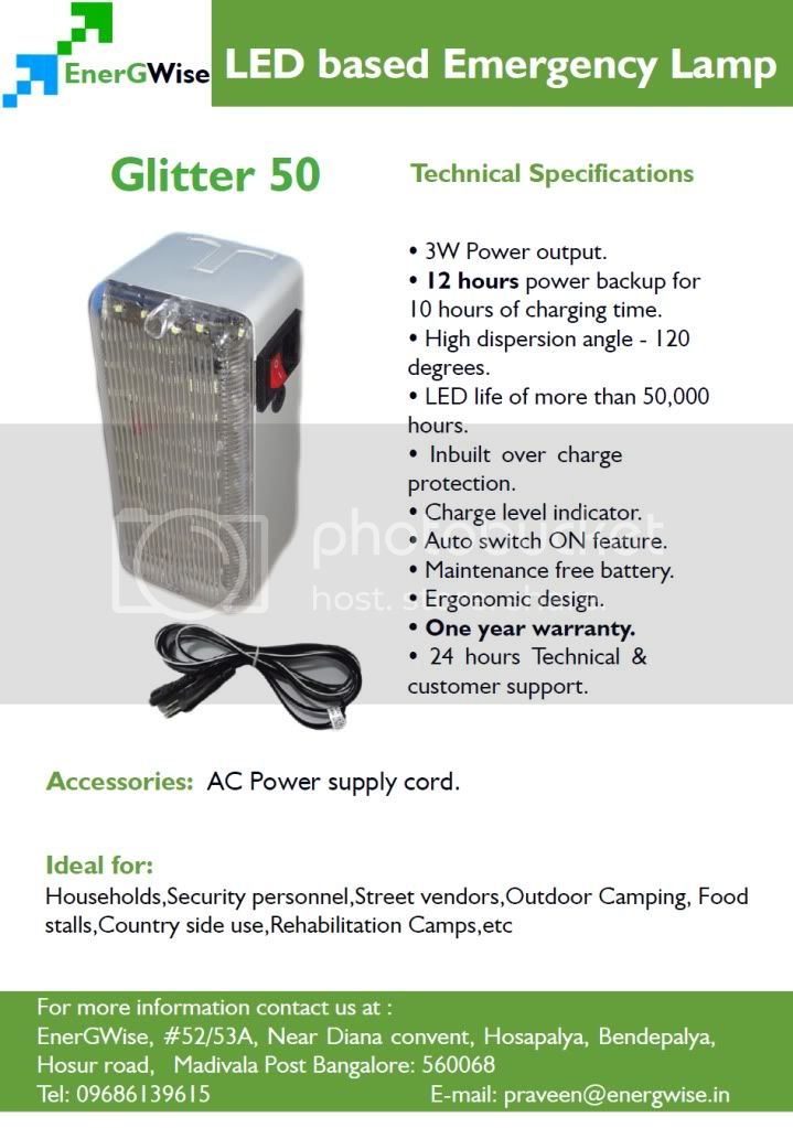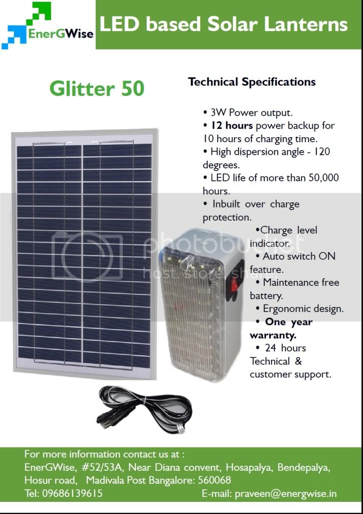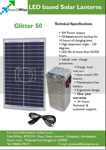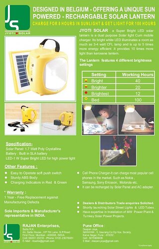 We introduce ourselves as Sole Importers & Manufacturer’s representative in India –for Solar Based High Quality Compact Lanterns –Designed in Belgium. JYOTI SOLAR’s Solar Lantern works for 100 Hrs after charging only once - for 8 Hr & is a grand success in Europe & Africa.