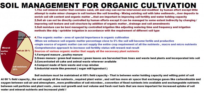 4.Soil health - In organic farming to enhance and enrich soil fertility status , we need to do crop roation, multiple cropping/mixed xropping , cover crops , bio fertilizers , Compost, Vermicompost , oil cakes , fish manure, horn manure , humic acid etc